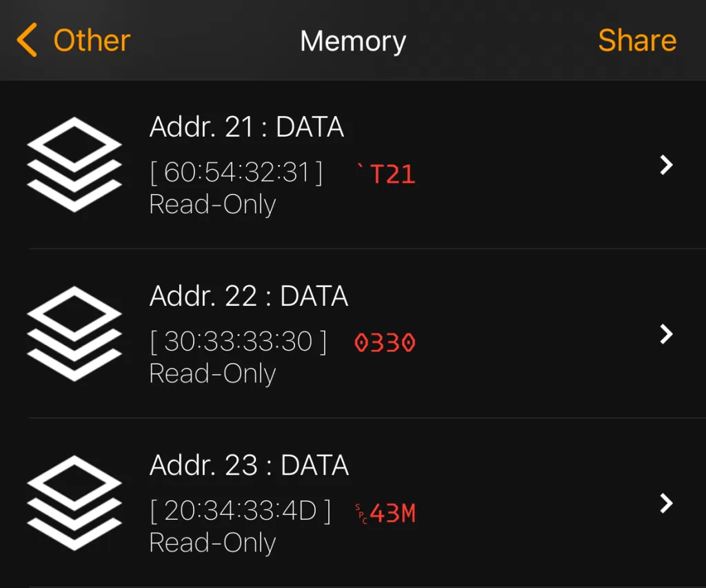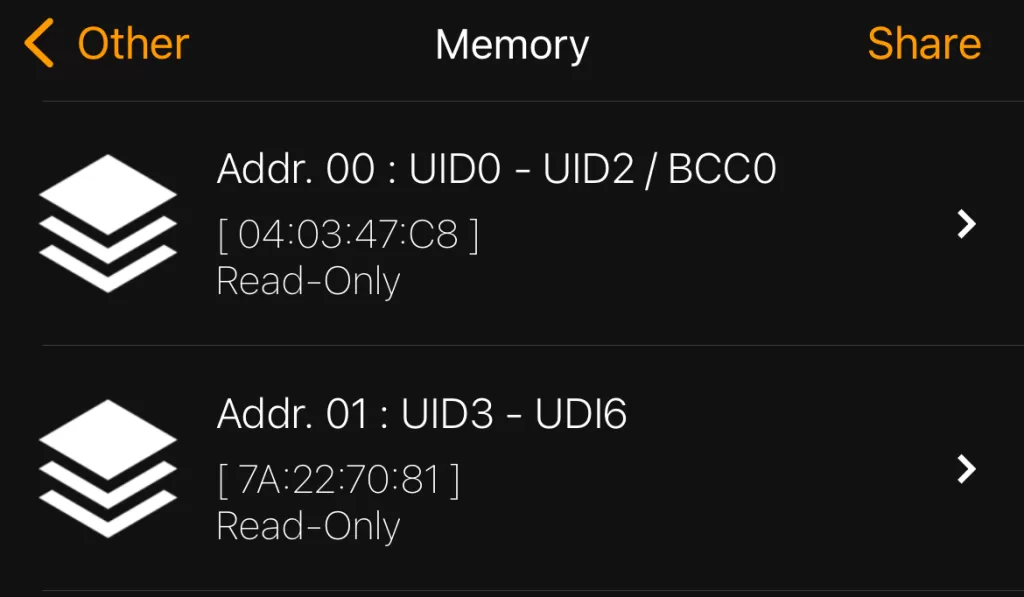Nyní musíte najít UID hlavy štětce. K tomu použijte aplikaci ke čtení čipu NFC hlavy štětce pomocí možnosti “Číst / Upravit paměť ” v nabídce “Jiné ”. Tím získáte dlouhý seznam adres a jejich dat. Najděte své UID v prvních dvou řádcích: