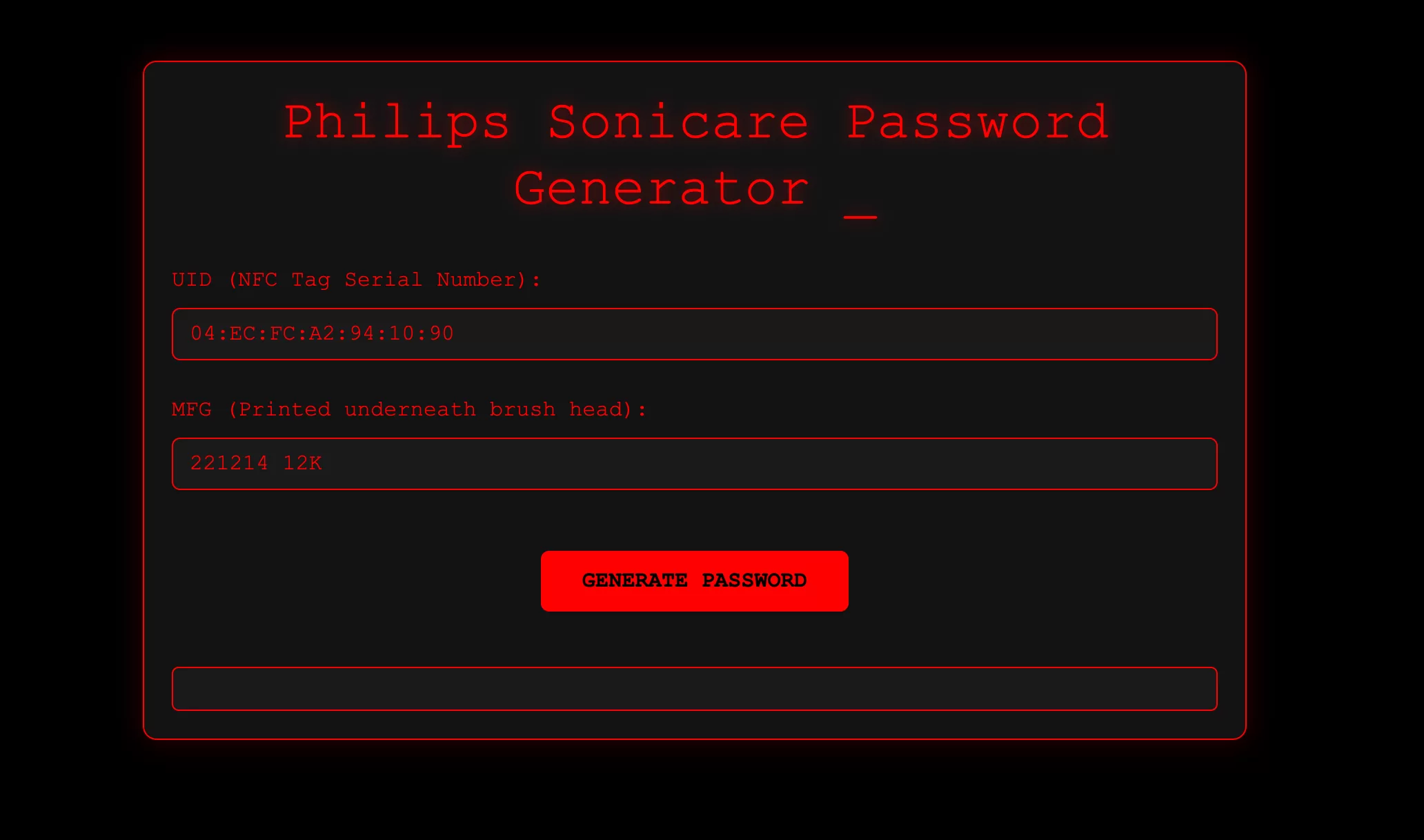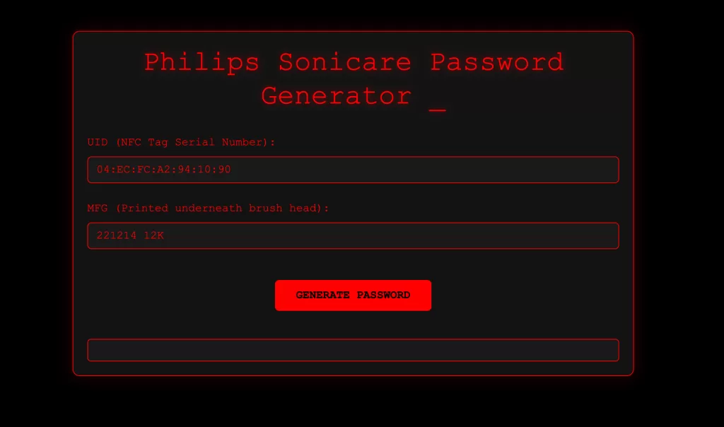 Tento generátor hesel umožňuje uživatelům snadno a rychle získat heslo pro svou konkrétní hlavici zubního kartáčku Philips Sonicare. Stačí zadat unikátní identifikátor (UID) hlavice a generátor obratem vygeneruje odpovídající heslo.