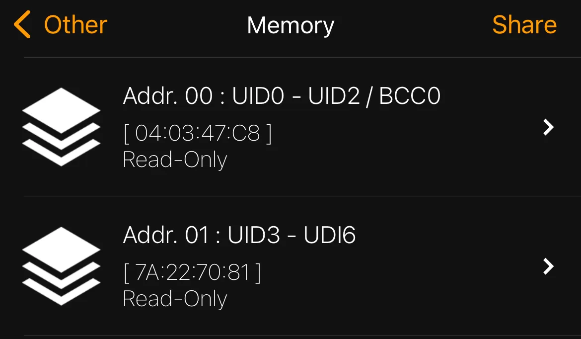 Ve výše uvedeném snímku obrazovky by bylo UID 04:03:47:7A:22:70:81. (Poslední bajt na první adrese je ignorován, protože se jedná o hodnotu BCC0 a nikoli část UID.)